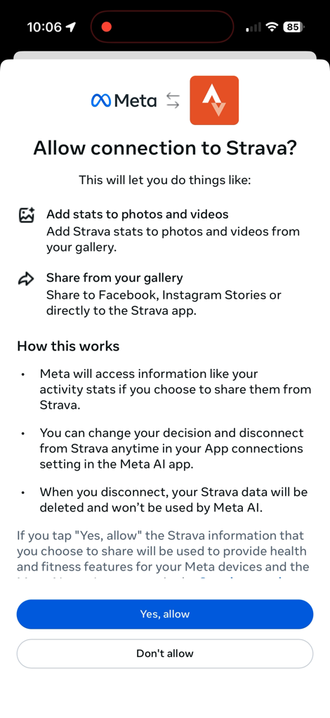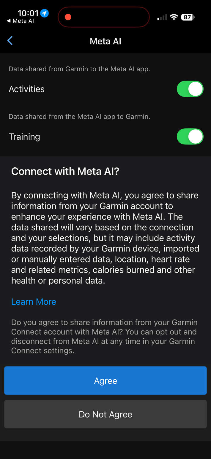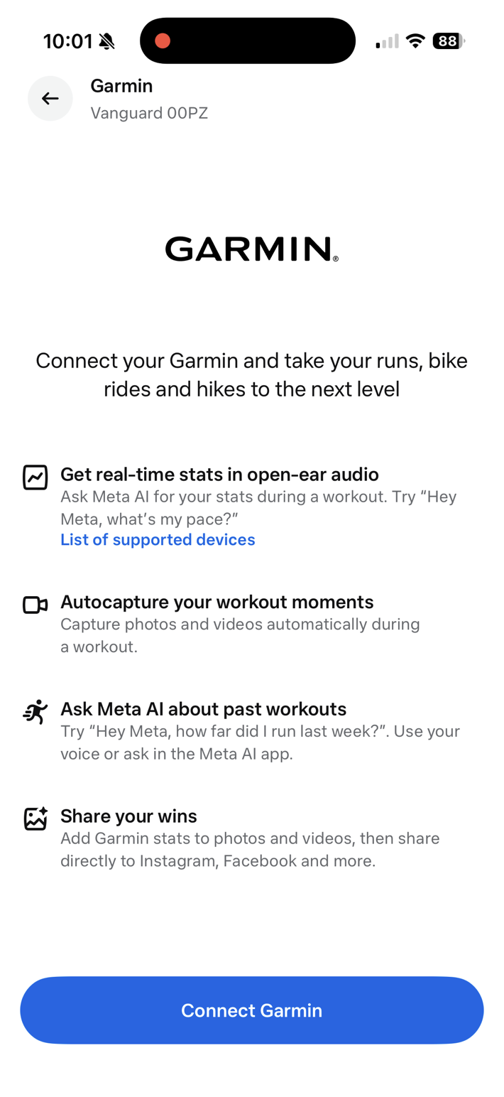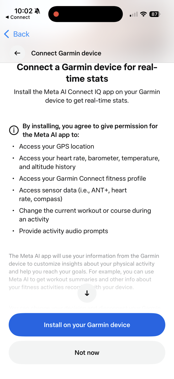 First up, is getting it setup. This is sorta a two-parter. First, is linking the Meta AI app to your Garmin Connect account. If you’ve previously linked your Garmin account to other platforms, then you’ll find it familiar. It’s a few quick steps, and you’re good to go.