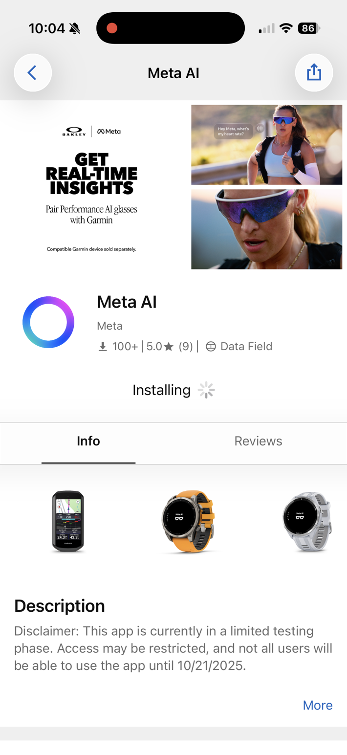 Next, you’ll need to install the Meta Connect IQ app on your Garmin device (watch/bike computer). This is the piece that holds the whole thing together. Basically, the Meta app on the watch is talking to your phone, which in turn talks to the glasses. The glasses aren’t directly talking to the watch, because the phone still needs to be involved anyway for Meta to process the voices/AI bits (remember, the glasses are basically just headphones/speaker/mic with a camera).