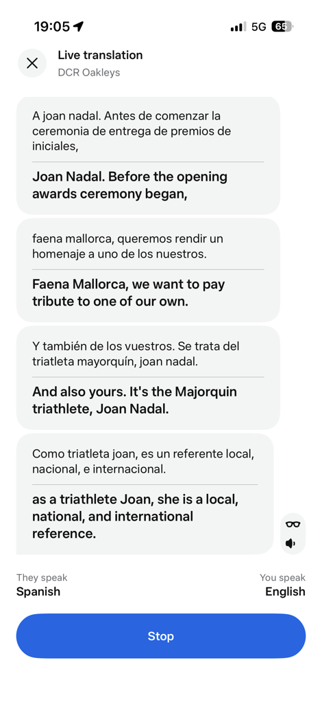 Next, there’s Live Translations. This was super cool, because it’s pretty much transparent to those around you (versus wearing headphones, which gives the impression you’re not paying attention). The other night I was at an awards ceremony/event, and given I live in Spain, a lot of it was in Spanish. I was able to simply turn on live translation and listen to the translation in English. It was slightly delayed, but generally pretty good. My Spanish friends were very impressed with it, especially watching the app also translate in real-time: