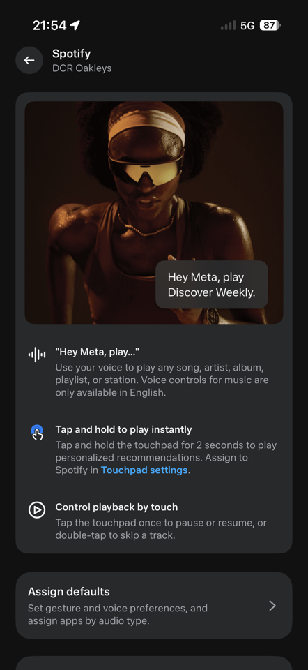 For music, you can connect the glasses to Amazon Music, Apple Music, Audible, Shazam, and Spotify. In my case, I linked it up to Spotify, and it worked super well. I just said “Hey Meta”, and then asked for whatever album/artist/etc that I wanted. It almost never got it wrong.
