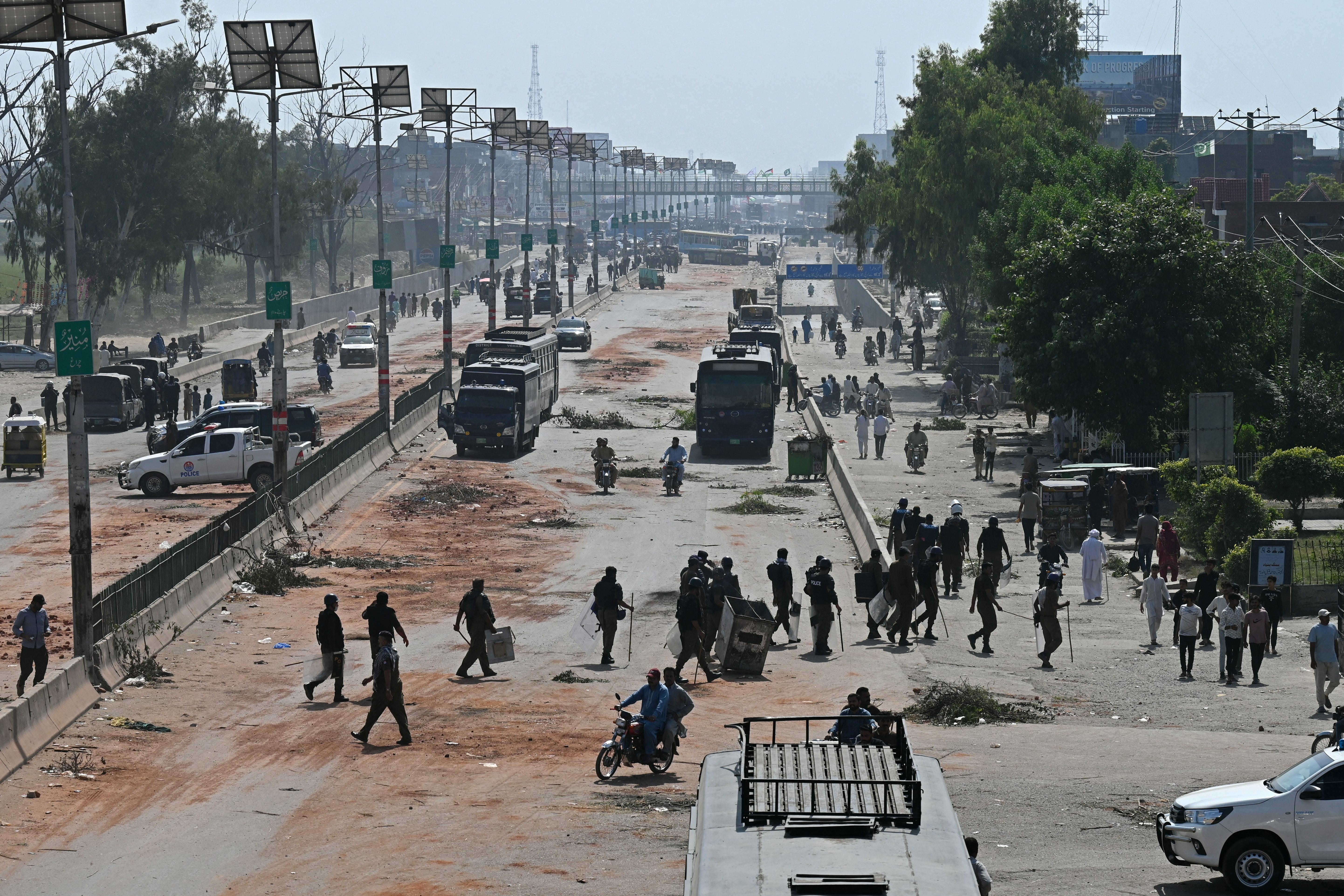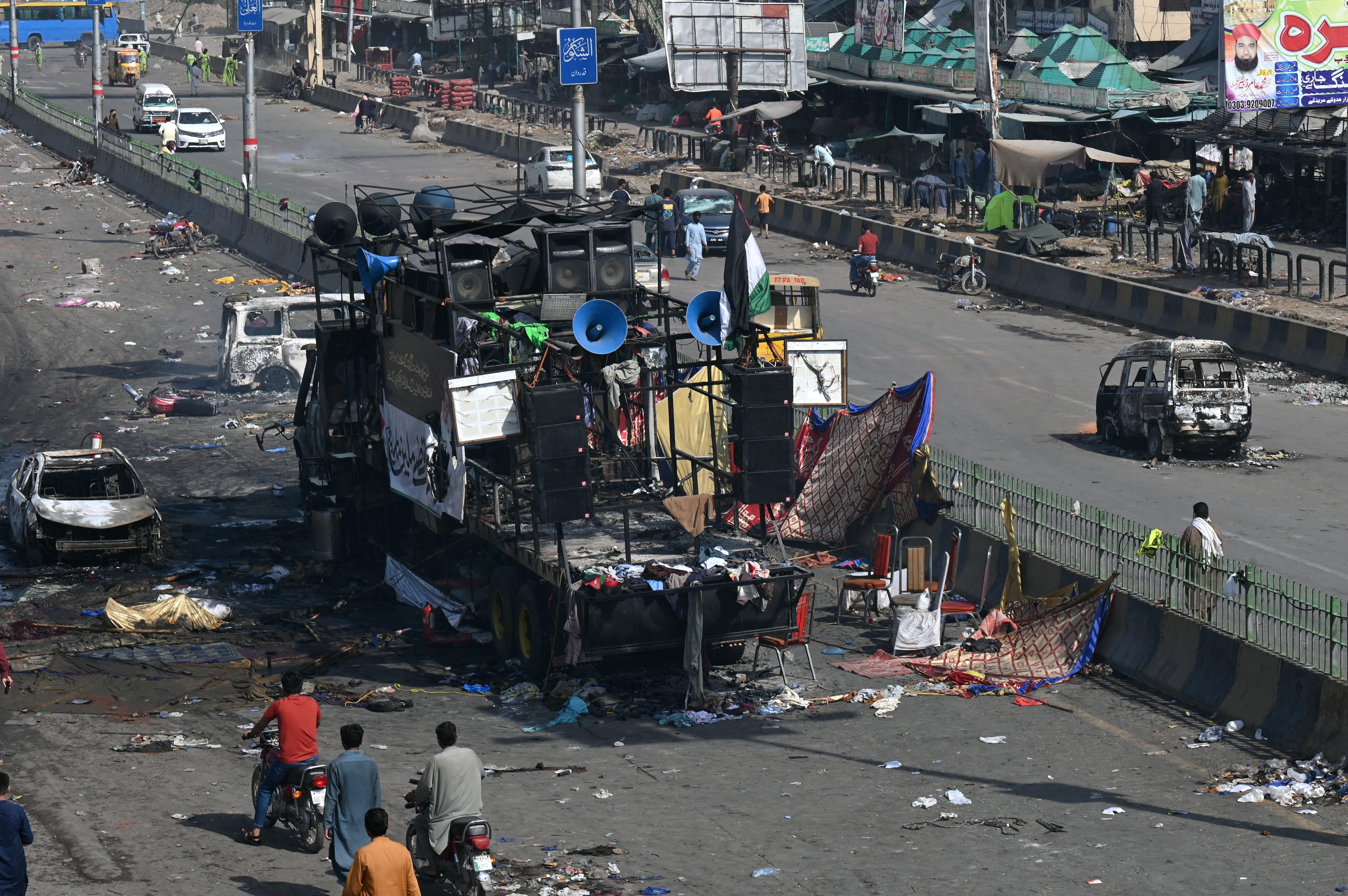 Aftermath of the crackdown on the Tehreek-e-Labbaik Pakistan party’s protest in Muridke on October 13, 2025. Photo by ARIF ALI/AFP via Getty Images.