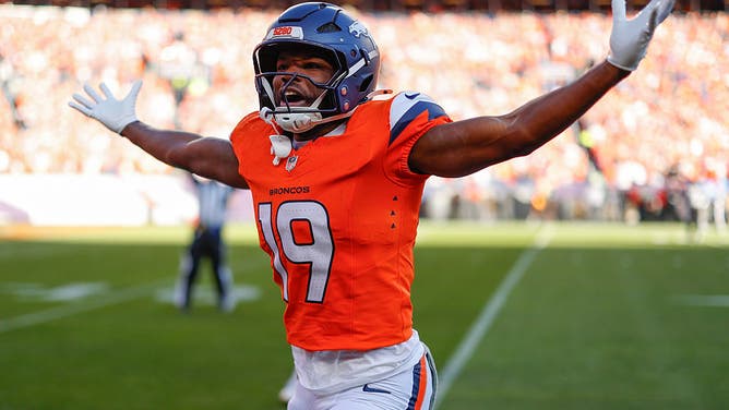 Marvin Mims Jr. #19 of the Denver Broncos reacts after a punt return against the Kansas City Chiefs during the first quarter at Empower Field At Mile High on November 16, 2025 in Denver, Colorado. (Photo by Justin Edmonds/Getty Images)