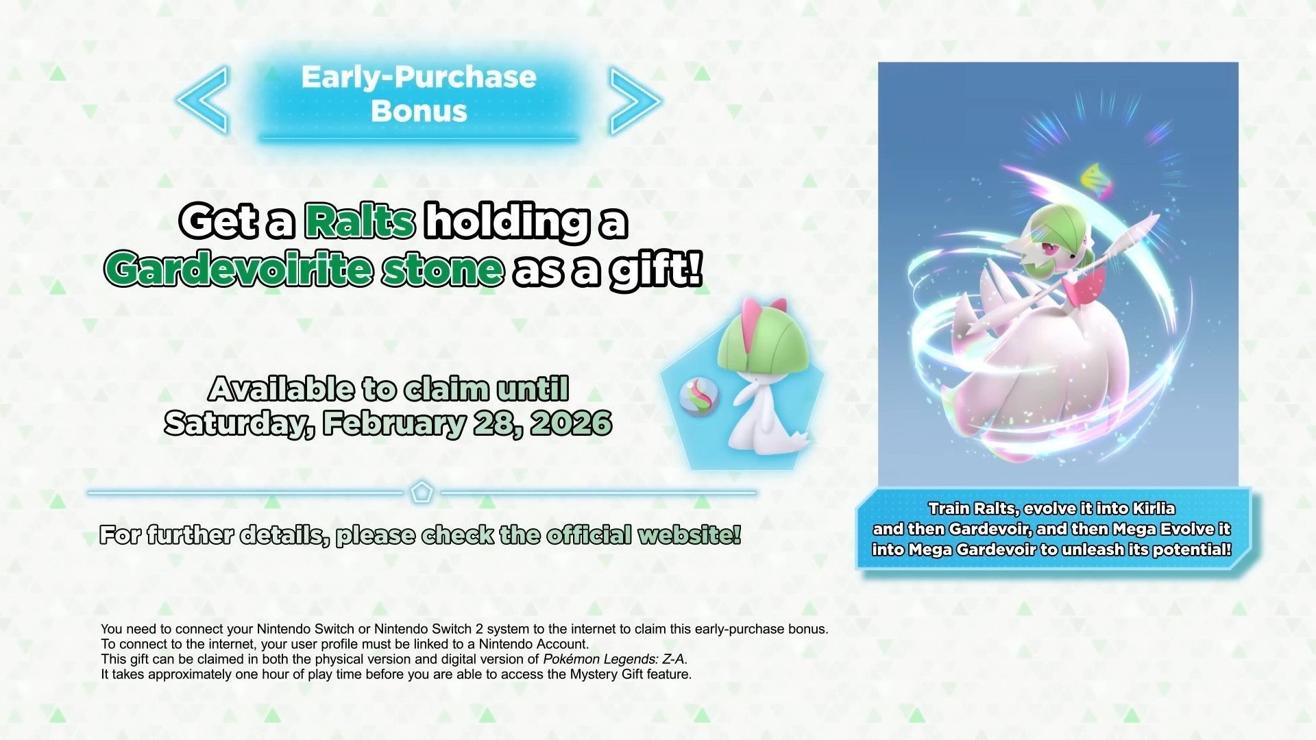 In case you missed the initial announcement, The Pokémon Company will be offering trainers across the globe an “early-purchase bonus” in the form of a Ralts holding a Gardevoirite stone as a gift. When trained, Ralts evolves into Kirlia and then Gardevoir. From there, it can be Mega Evolved into Mega Gardevoir.
