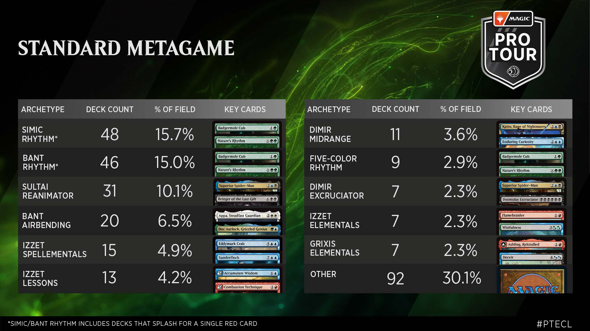 Izzet Lessons, the breakout deck from Magic World Championship 31, has largely fallen off, representing only a modest slice of the field. This weekend, the spotlight belongs to Llanowar Elves, Gene Pollinator, Badgermole Cub, Spider Manifestation, Quantum Riddler, and Nature’s Rhythm. As many as 106 competitors (34.6% of the field) submitted decks built around this formidable core of mana acceleration creatures and powerful payoffs.