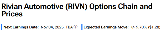 Indeed, it currently says that options traders are expecting a 9.70% move in either direction in RIVN stock in reaction to Q3 2025 results.