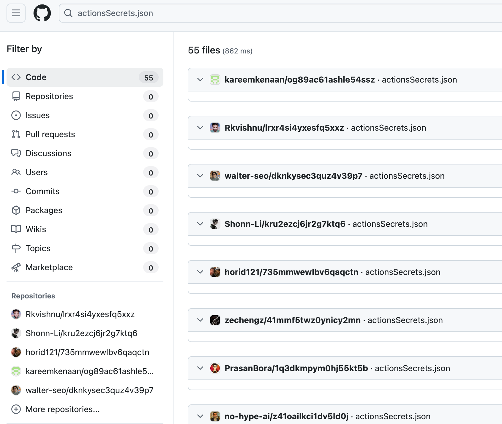 - Exfiltrates all GitHub Actions secrets and uploads them as an artifact to a file named “actionsSecrets.json” in the exfiltration repositories, after which it’s downloaded to the compromised machine and the workflow is deleted to conceal the activity