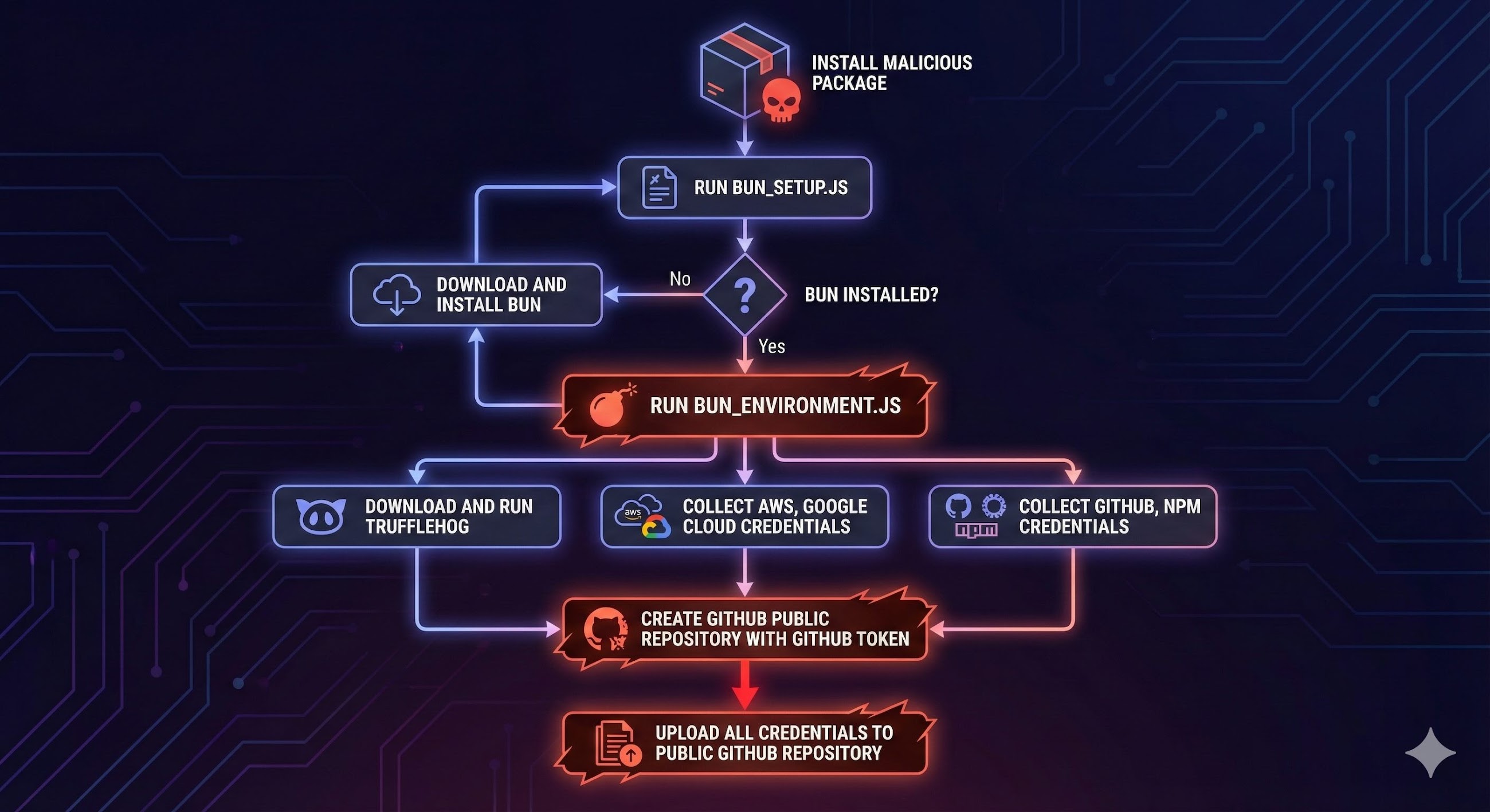To automatically propagate the malware, the attack fetches a maximum of 100 packages associated with a valid npm token, injects “setup_bun.js” and “bun_environment.js” into each of them, patches package.json to add the preinstall script, bumps the package versions (x.y.z → x.y.z+1), and publishes them to the repository.