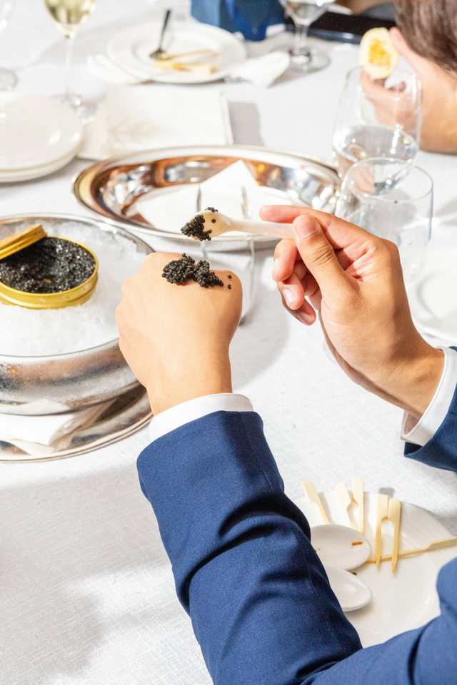 Each table was brought a tin of caviar on ice and blinis. Geoffrey Chen of Caviar House & Prunier guided the founders in a posh accent through how to take a bump of the salt-cured sturgeon eggs. He advised them to use a mother-of-pearl spoon to avoid ruining the taste with metal and offered a rule to live by: Always order Champagne, never rosé.