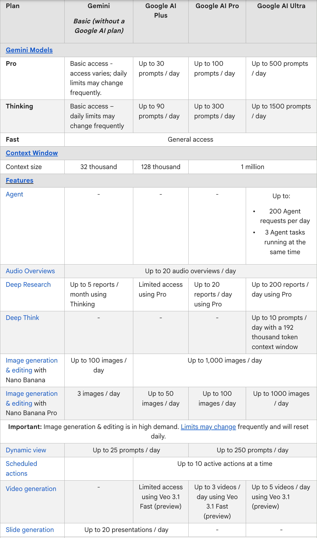 | Gemini Model | Access to Gemini models | Access to Gemini models | Higher access to Gemini models | Highest access to Gemini models |
