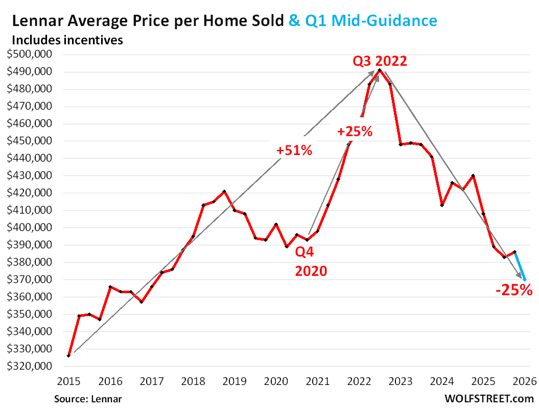 As a result, the average price of the homes that it sold has plunged; and for Q1 2026, it guided the average price down further, to a range of $365,000 to $375,000 net of incentives. The mid-point ($370,000 blue in the chart) would be the lowest sales price since Q1 2017, and down by 25% from the peak in Q3 2022 ($491,000).