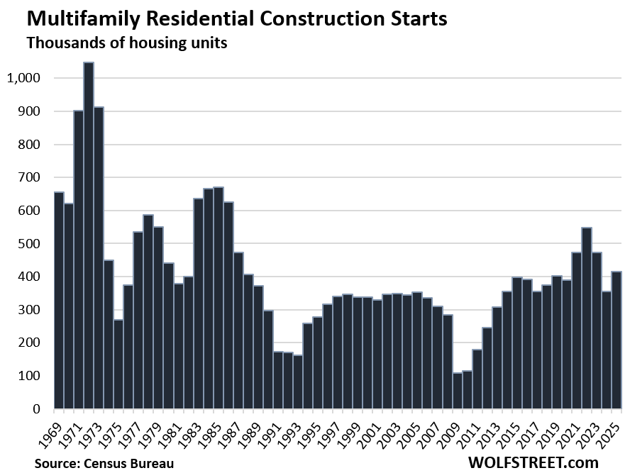 Construction starts of privately owned multifamily housing units (rentals and condos in buildings of 2 or more units) rose by 17.4% to 416,000 units in 2025.