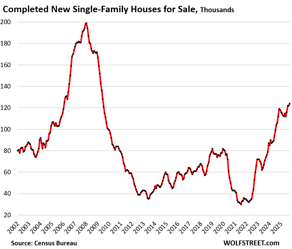 About 2.3 people occupy a housing unit on average. So the 1.36 million housing units that were started in 2025 would provide a home, when completed, for 3.1 million additional people. But the US population increased by only 1.78 million people in the 12 months through mid-2025; and for the 12 month through mid-2026, it is projected to grow by only 756,000 people; and growth might further decline in the following years, according to the Census Bureau’s estimates.
