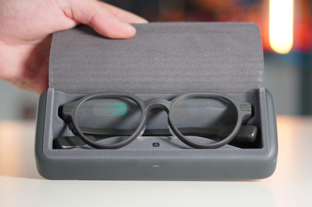 When it comes to other input methods, similar to the G1 glasses, these have no cameras, no speakers, no flashing lights. Just well-built, high-end eyewear that happens to be smart. That decision makes them feel much more socially acceptable. Battery life is also best in class for smart glasses, giving you two days on a single charge, and the case provides an additional 6-7 charges. So you can technically go two full weeks without plugging them in.