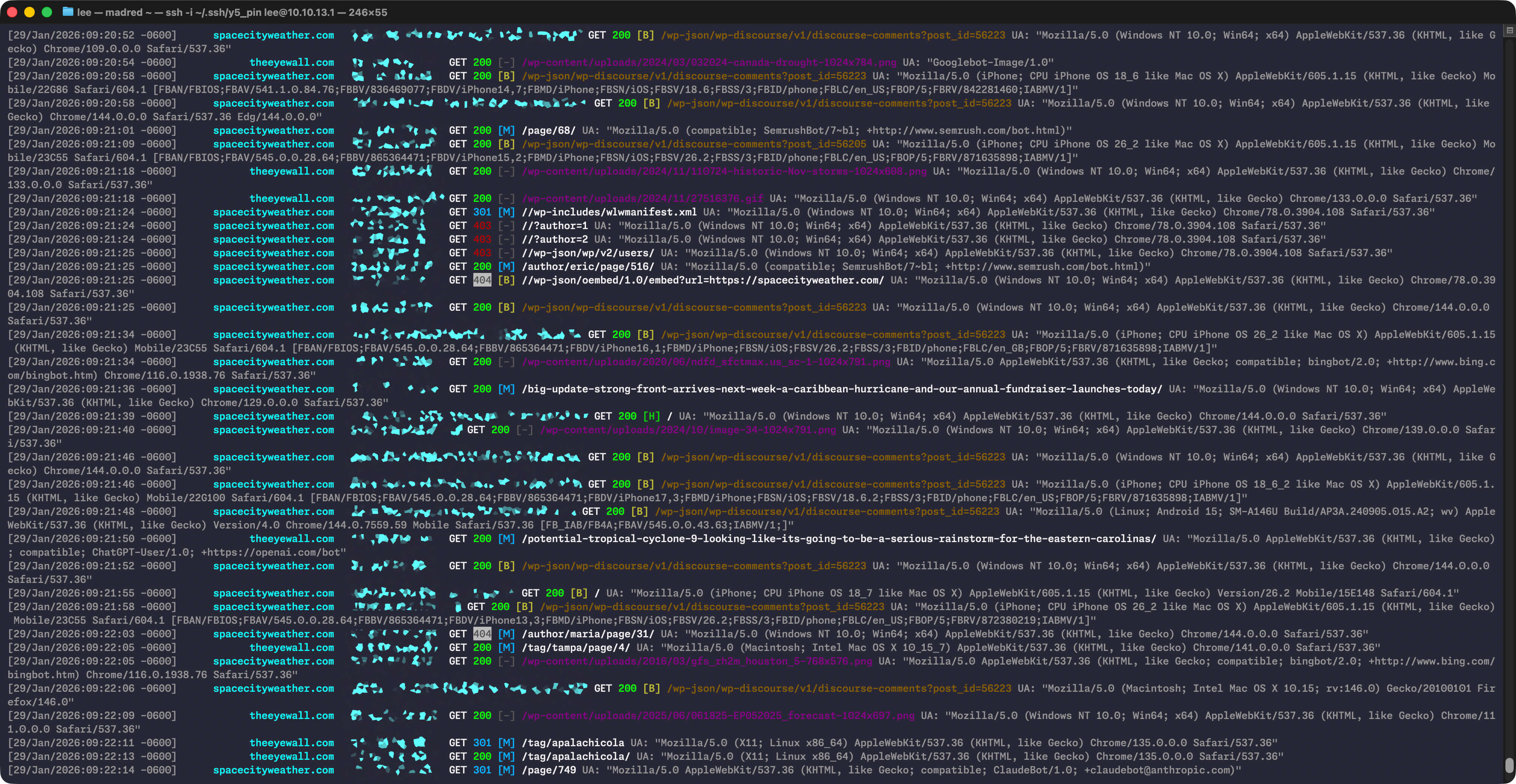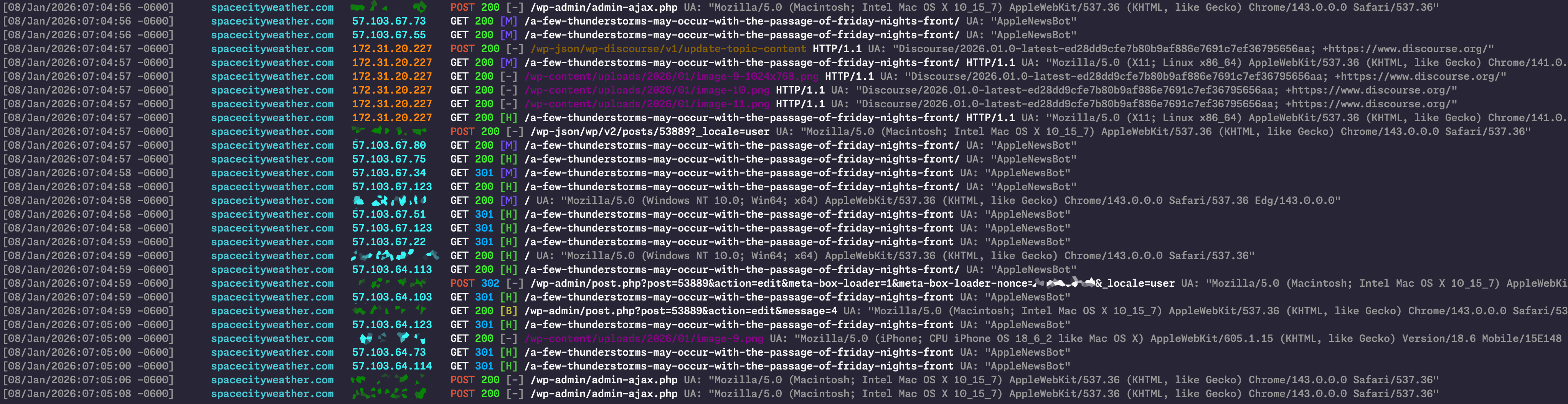 Less briefly: I’ve blurred out Eric’s IP address, but it’s dark green, so any place in the above image where you see a blurry, dark green smudge, that’s Eric. In the roughly 12-ish seconds presented here, you’re seeing Eric press the “publish” button on his daily forecast—that’s the “POST” event at the very top of the window. The subsequent events from Eric’s IP address are his browser having the standard post-publication conversation with WordPress so it can display the “post published successfully” notification and then redraw the WP block editor.