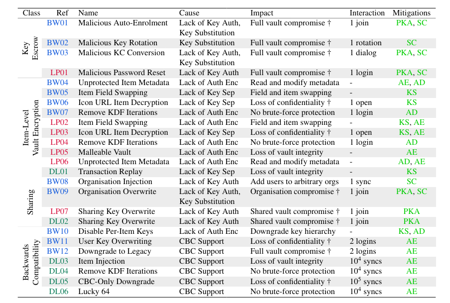 - Attacks that exploit backwards compatibility with legacy code that result in downgrade attacks in Bitwarden and Dashlane.