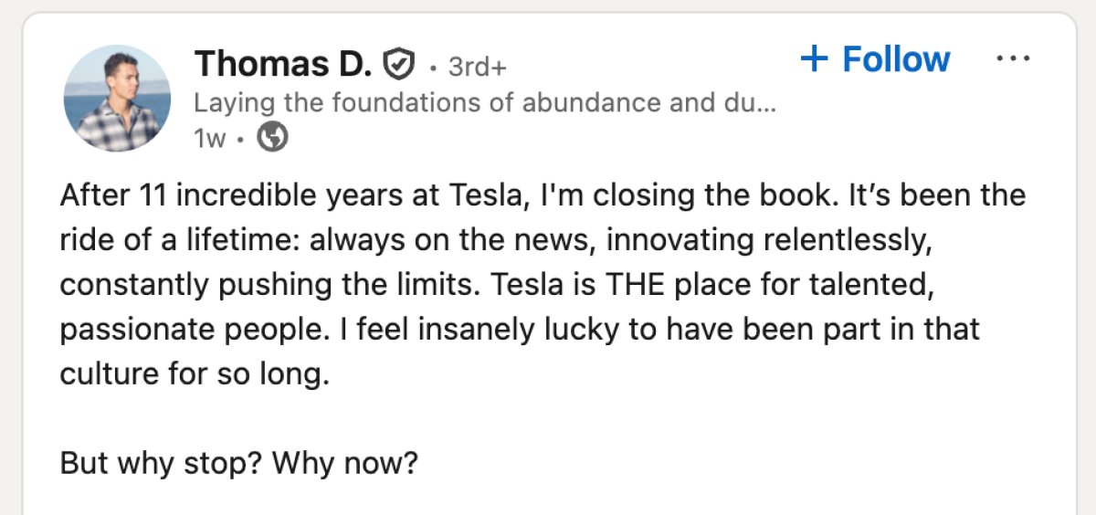 Despite writing that Tesla’s future is extremely bright and that Tesla is just getting started, Dmytryk noted that he is stepping away from the relentless pace of Tesla’s engineering culture to focus on his family, rather than take up a new position elsewhere.