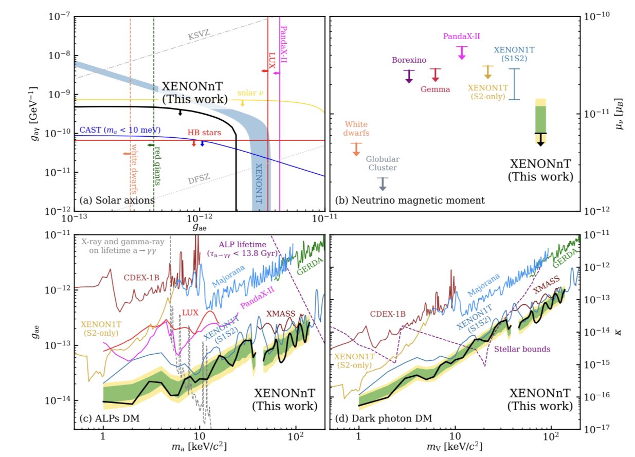 This 4-panel graph shows constraints on solar axions, on the neutrino magnetic moment, and on two different “flavors” of dark matter candidates, all constrained by the latest XENONnT results. These are the best such constraints in physics history, and remarkably demonstrate just how good the XENON collaboration has gotten at what they do. Axions, like other dark matter candidates, have not yielded a positive direct detection signature yet.