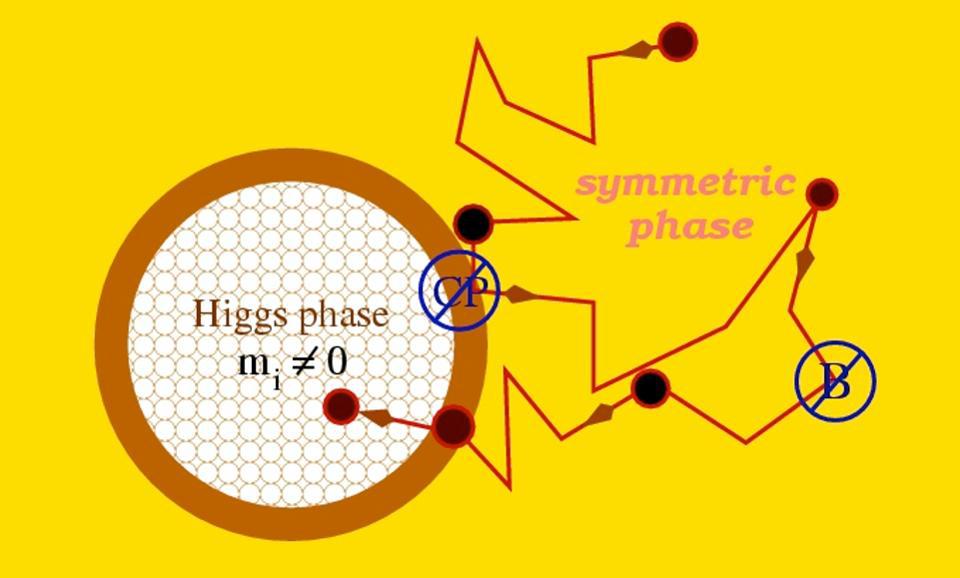 When the electroweak symmetry (the symmetry that corresponds to the Higgs field) breaks, the combination of CP-violation and baryon number violation can create a matter/antimatter asymmetry where there was none before, owing to the effect of sphaleron interactions working on, for example, a neutrino excess. This can only occur, however, if the electroweak phase transition is first-order, rather than the second-order transition predicted by the Standard Model alone.