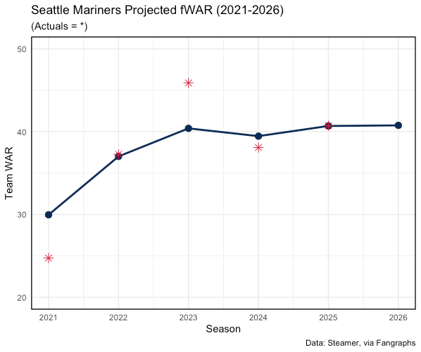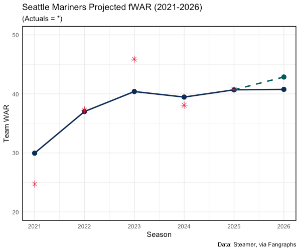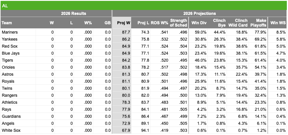 Fangraphs on Monday dropped their standings model for 2026 and the commensurate playoff odds . It was the biggest news for most of the morning because the Mariners, wouldn’t you know it, were the top projected team in the American League. No, not the best team in the American League, a distinction reserved for the Yankees or the Blue Jays or maaaaybe the Red Sox. But instead the team projected for the most wins, thanks to their good fortune of not playing in the AL East.