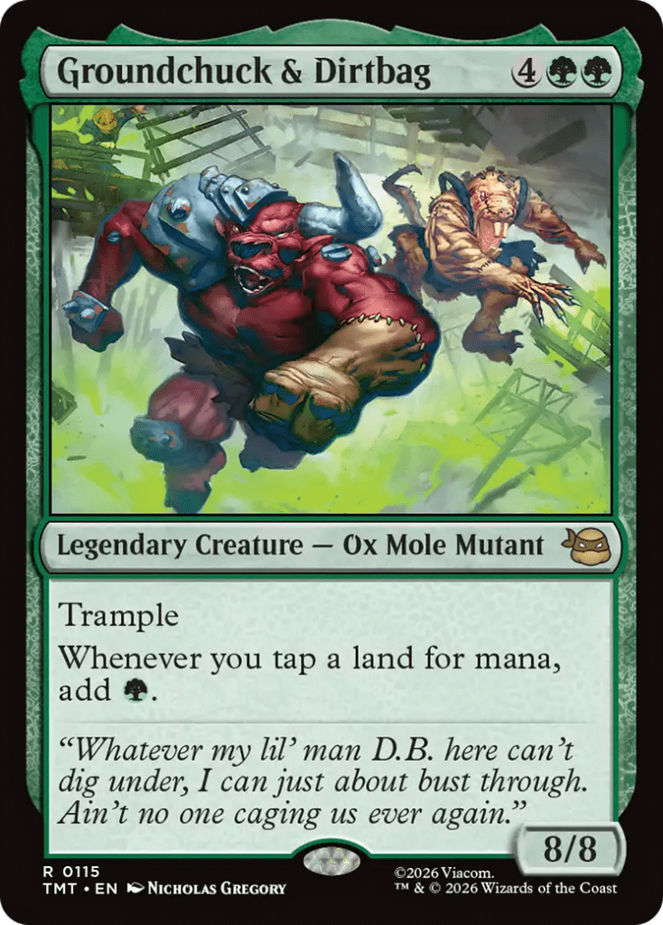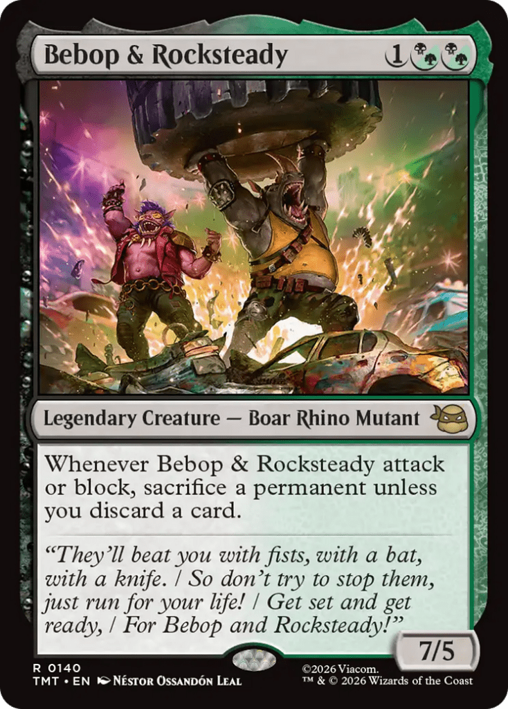 Bebop & Rocksteady hit really hard, but fare poorly versus chump blockers like 1/1 robots. This is a high variance card that gets better if you can provide some fodder for it, like Food tokens.