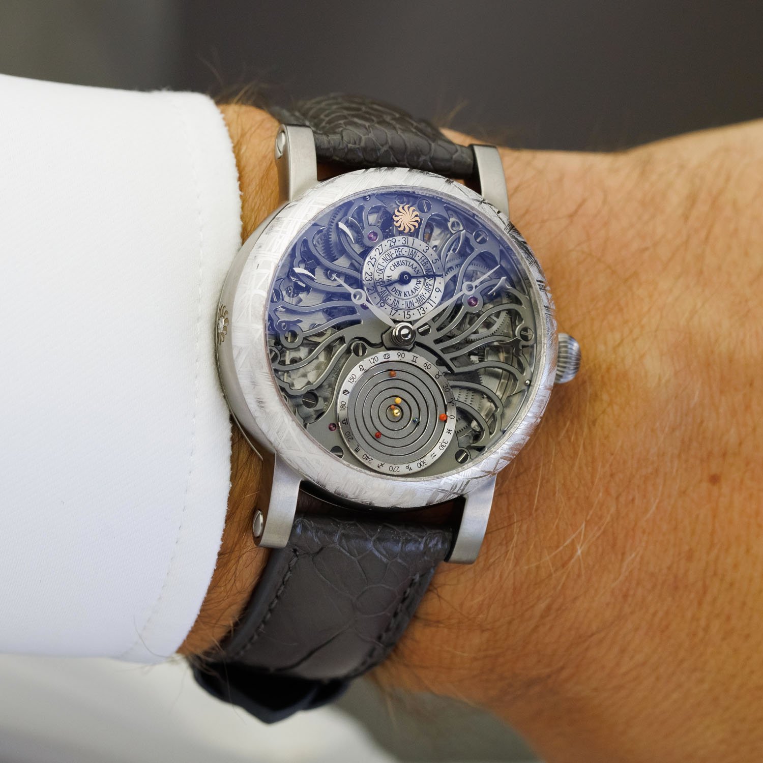 Christiaan van der Klaauw is one of the most famous watchmakers in the Netherlands and probably worldwide when it comes to hand-made, astronomical complications. Probably the most impressive achievement of his career was the development in the 1990s of the planetarium wristwatch, which became the world’s smallest mechanical planetarium. A planetarium is a device that tries to illustrate accurately the motion of the solar system and its planets revolving around the sun. With the recent Grand Planetarium Eccentric, CVDK presented the first of its kind to be fitted on a wristwatch and capable of displaying the 8 planets of our solar system. But there’s another important watch, built in 1995, that started it all: the CVDK Kepler’s Planetarium Clock. If it isn’t as complete as the recent model, the miniaturisation of the complication is spectacular.