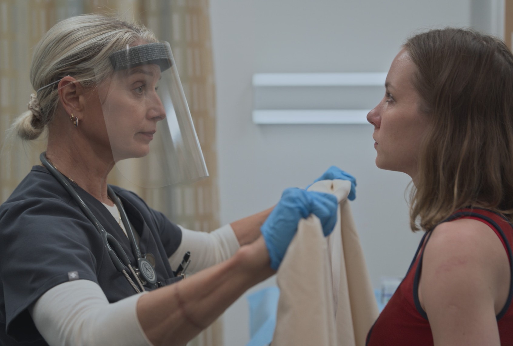 “Fun fact, healthcare workers are five times more likely to face violence in the workplace,” shares Allison Tolman’s supervising nurse, Alex, in one of the show’s mockumentary-style confessionals. “And there was a state bill to address this, but it failed. On the bright side, they did pass a bill to rename a bridge after Jeff Bridges. So that’s cute.”