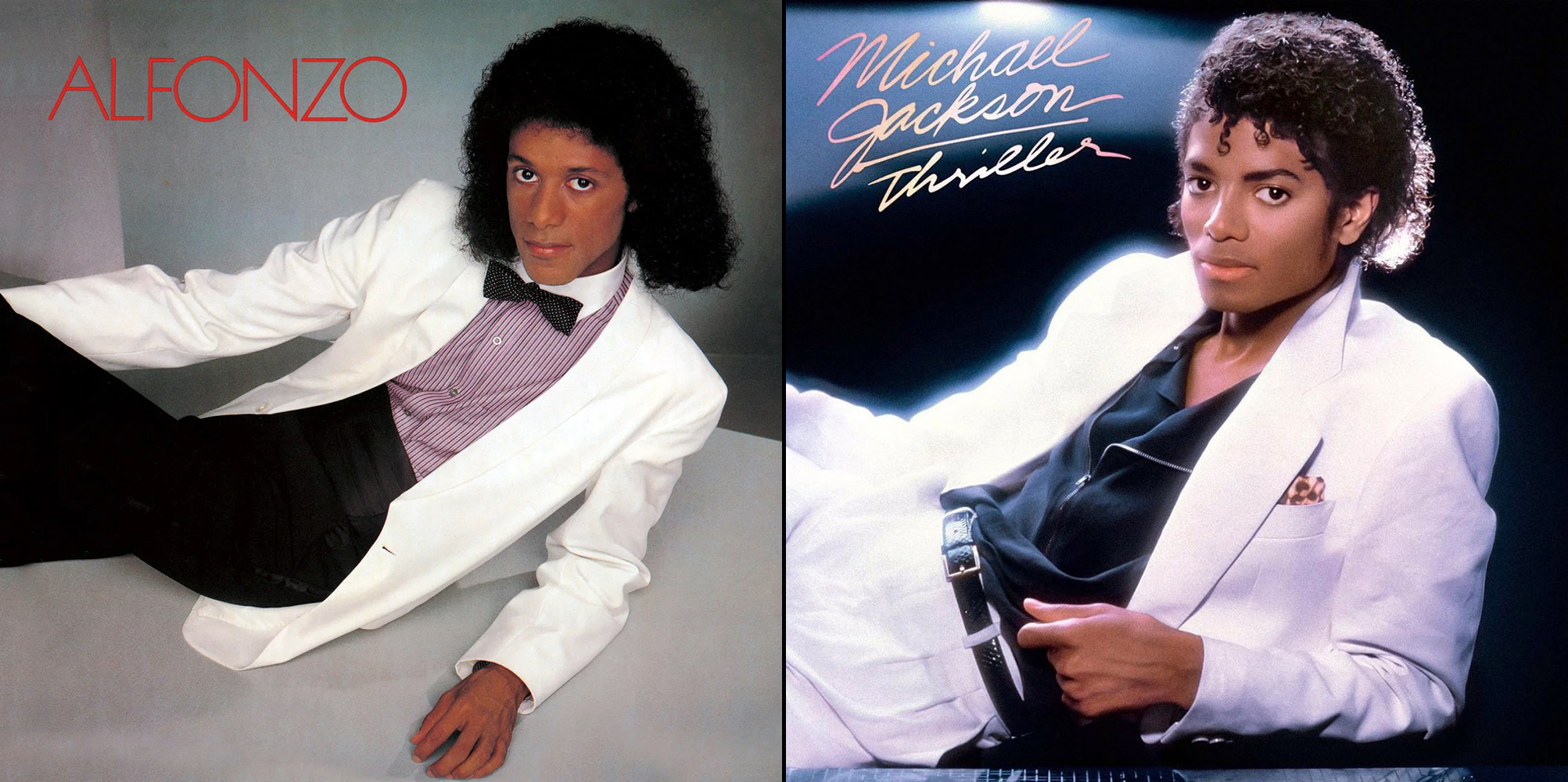 He’s also pleased by the comparisons he’s seen others draw between his Alfonzo album and Thriller, such as how each album cover shows the singers reclining in white tuxes. Each features vocalists who sing catchy R&B floor bangers, like, in Alfonzo’s case, “Your Booty Makes Me Moody,” which he ornamented with brass filigrees and off-the-cuff, MJ-like “woos.” But what got internet sleuths hung up is how Alfonzo reportedly hit shelves months ahead of Thriller.