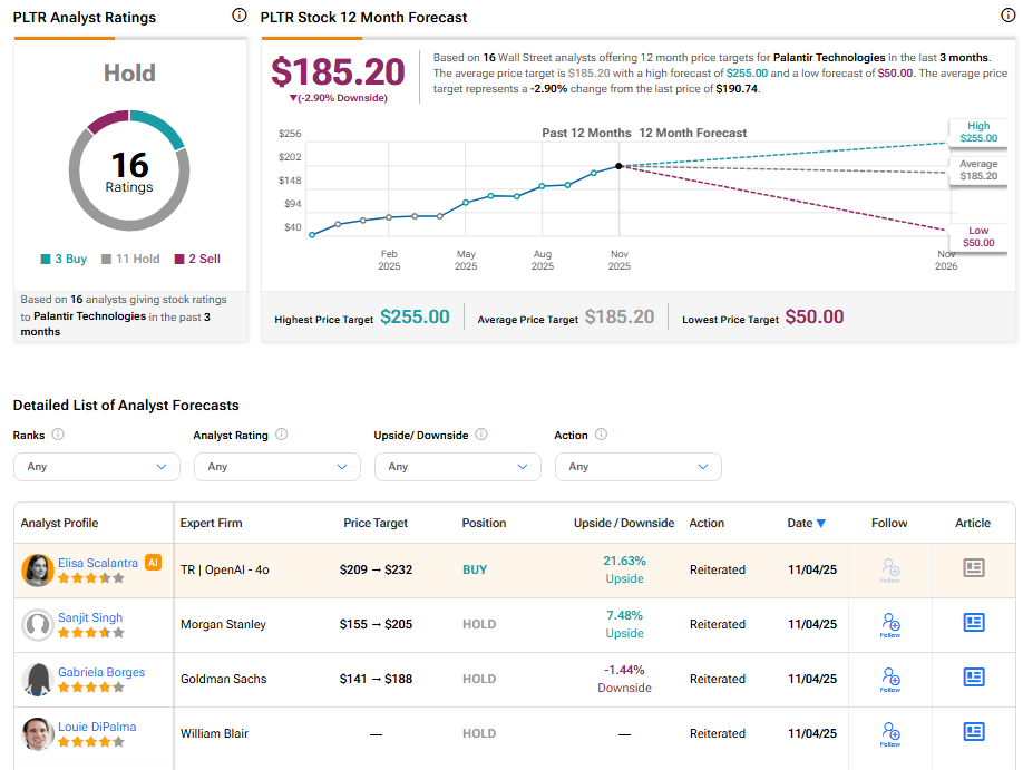 Currently, Wall Street has a Hold consensus rating on Palantir Technologies stock based on 11 Holds, three Buys, and two Sell recommendations. The average PLTR stock price target of $185.20 indicates a downside risk of 2.90% from current levels.