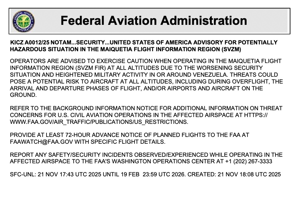“Operators are advised to exercise caution when operating in the Maiquetia Flight Information Region (SVZM FIR) at all altitudes due to the worsening security situation and heightened military activity in or around Venezuela,” the NOTAM read. In effect until Feb 19, it also requires that U.S. civil aviation operators file at least a 72-hour notice before flying in the area.