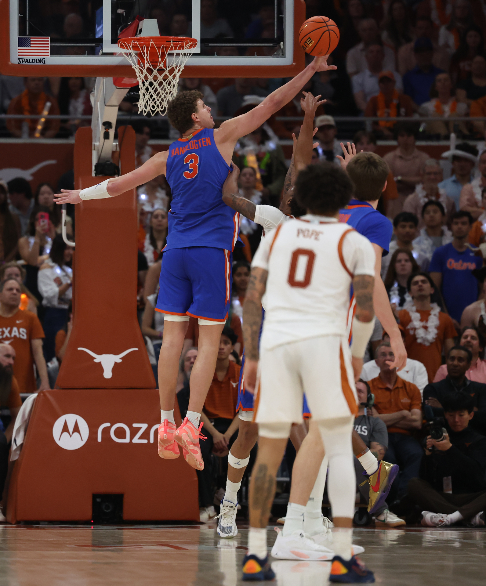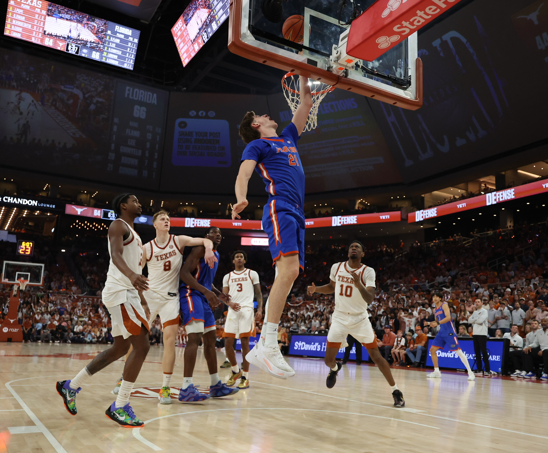 Out of the locker room, the Gators unfolded some of their best team defense of the season and eventually dropped a late, quick-strike hammer on the Horns in an 84-71 victory at Moody Center. Condon led all scorers with 23 points on 10-for-12 from the field, but also blocked four of the team’s season-high 11 shots, had three assists, no turnovers and posted a plus-21 on-floor score. Guard Boogie Fland checked in with a season-high 22 points, dropping seven of 10 shots, with a couple 3s and steals. Together, they combined to hit 17 of 22 field goals and paired nicely with guard Xaivian Lee’s 12 points and six assists.
