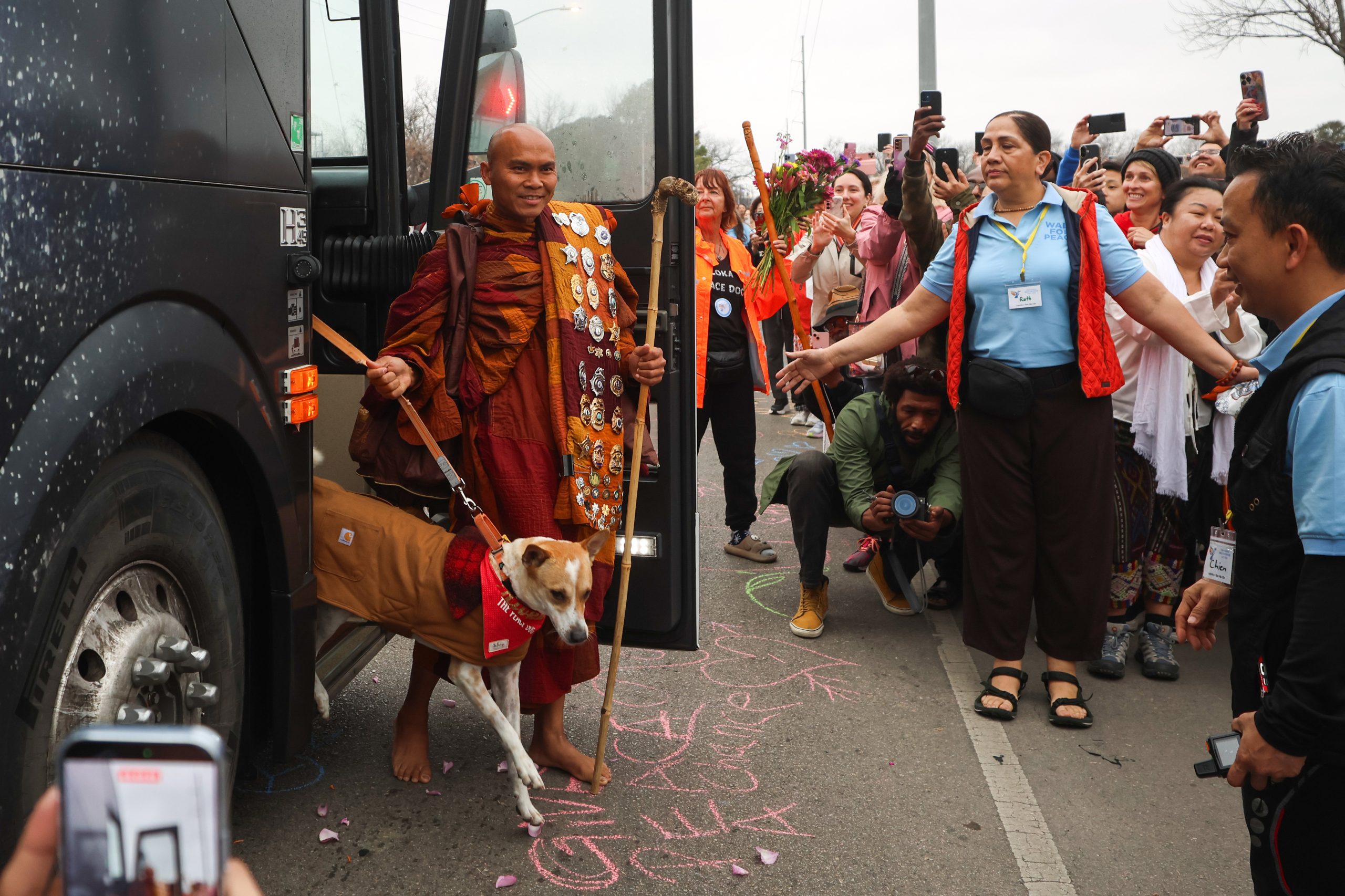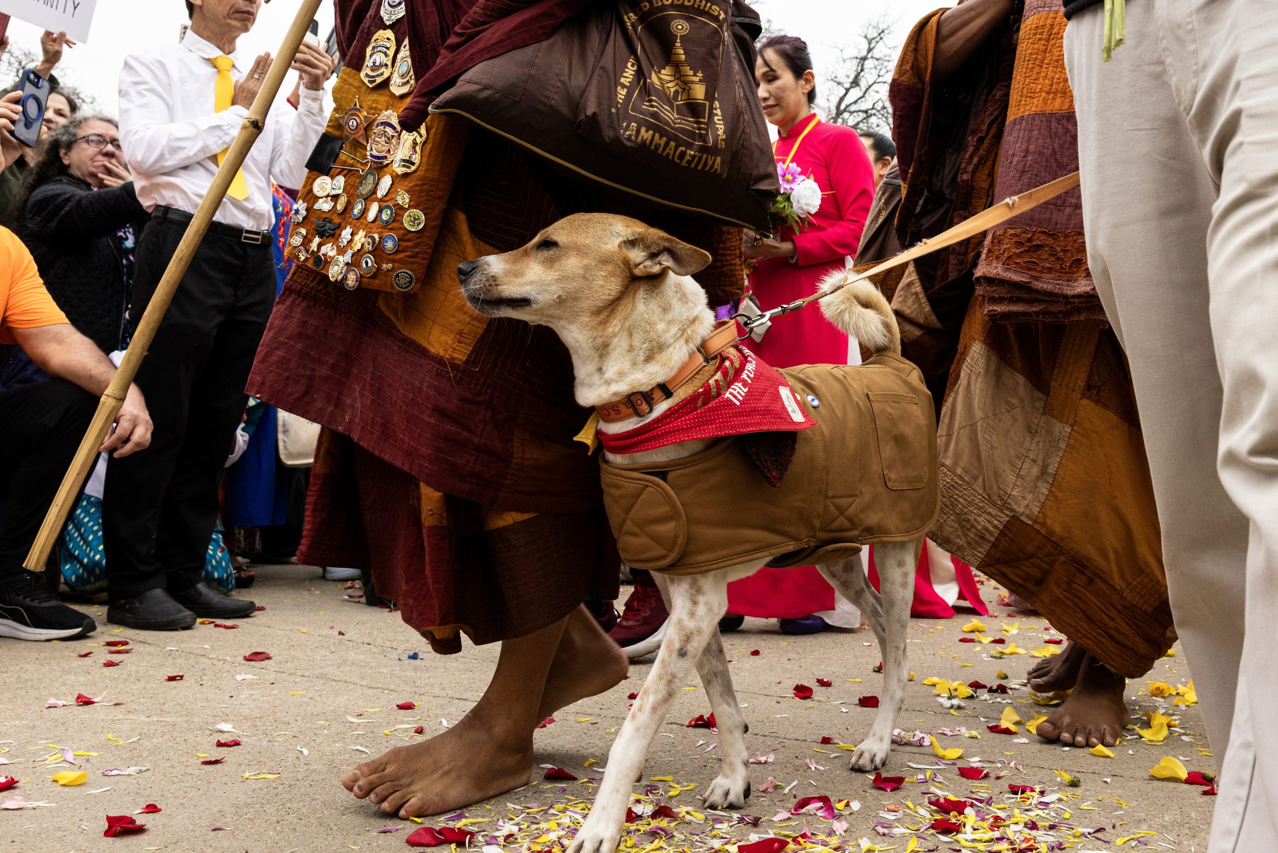They faced peril along the way. One monk’s leg was amputated after a car collision. Aloka had to have surgery following an injury. And below-freezing temperatures lingered over the last weeks of their walk.