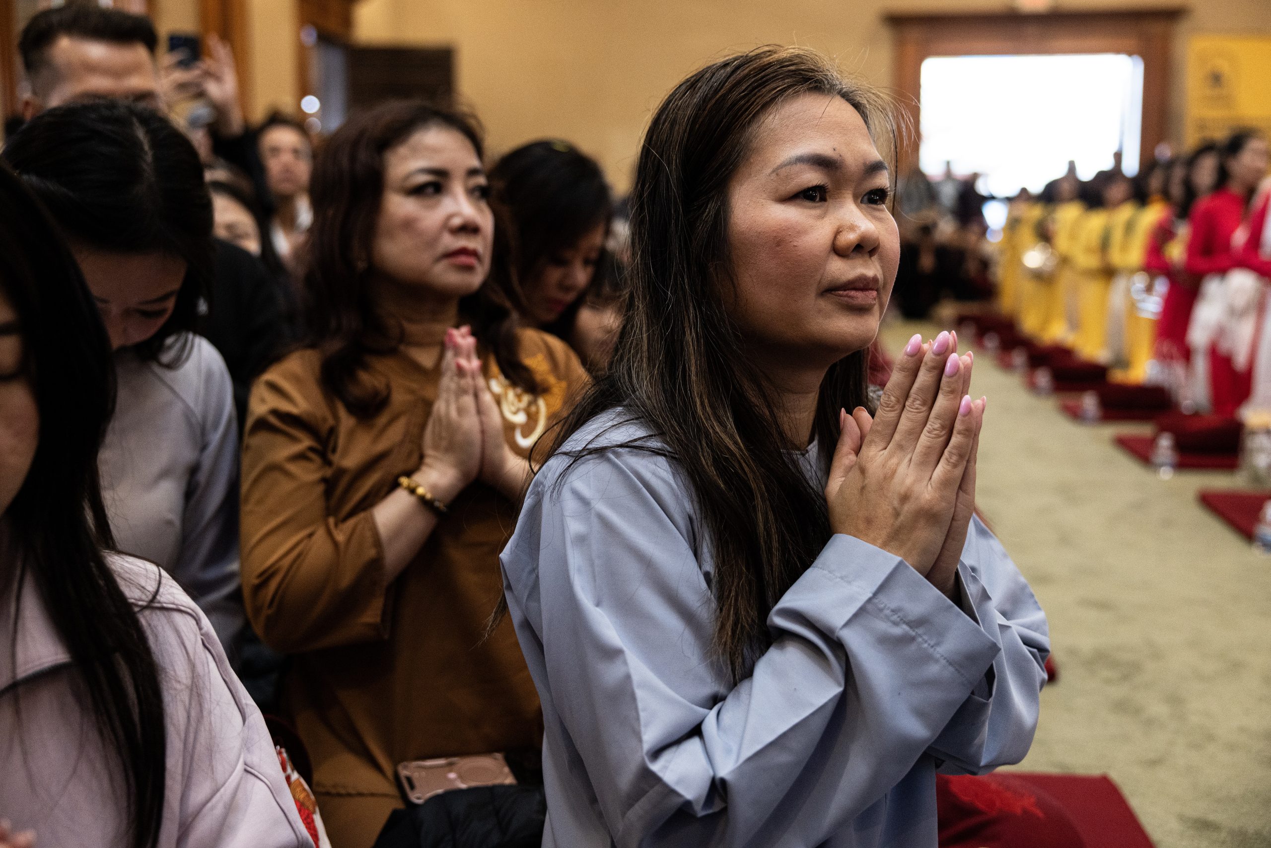 Volunteers spent the morning readying the center for the day’s festivities, running in and out of the temple to prepare food or rehearse their greetings ahead of the arrival.