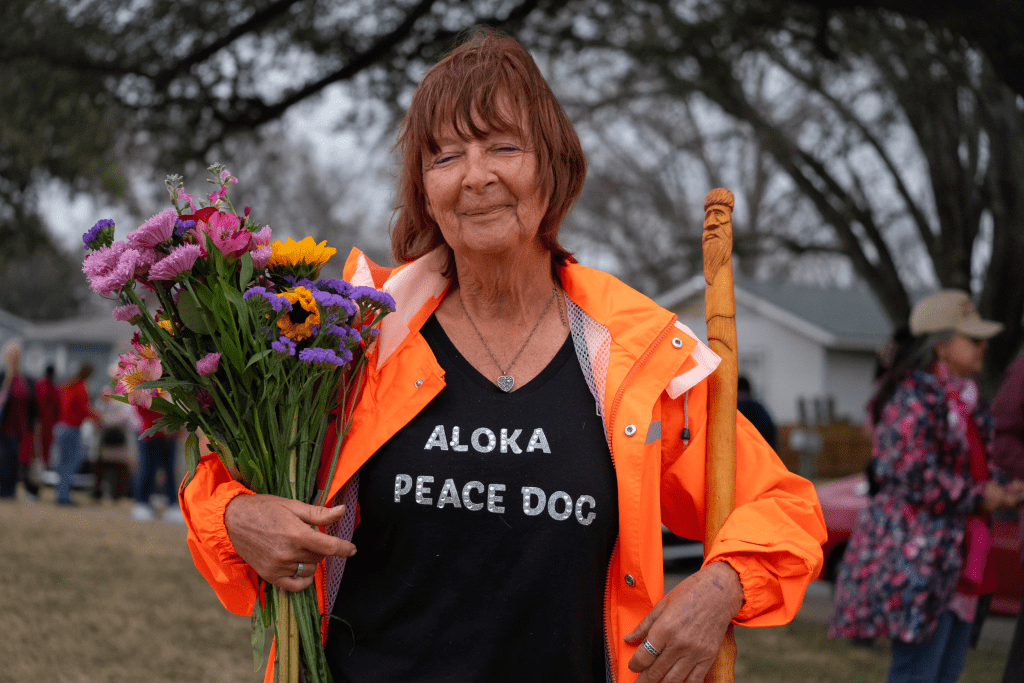 Standing on her front porch, she held flowers from a passerby and called out “hello” and “peace” as the final few people trickled by her lifelong home.