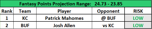 | 1 | KC | Patrick Mahomes | @ BUF | LOW |