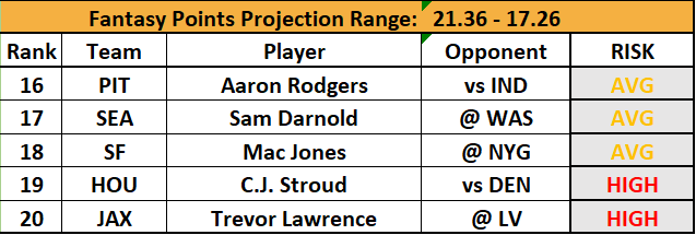 | 23 | CAR | Bryce Young | @ GB | HIGH |