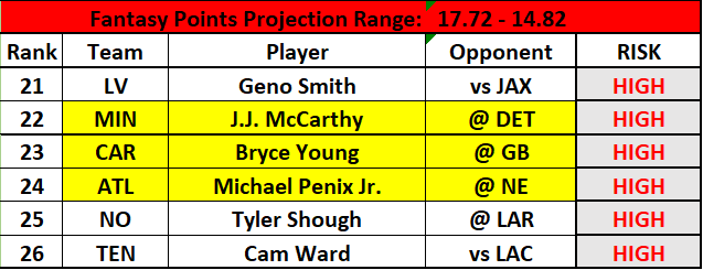 | 25 | NO | Tyler Shough | @ LAR | HIGH |