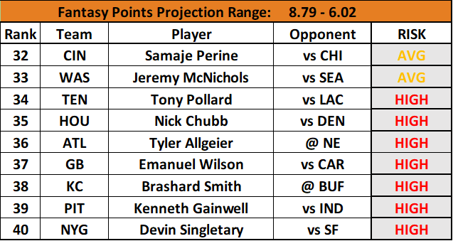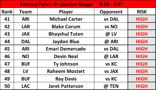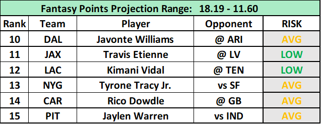 | 10 | DAL | Javonte Williams | @ ARI | AVG |