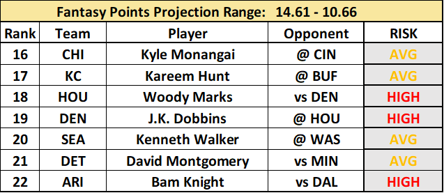 | 17 | DEN | J.K. Dobbins | @ HOU | HIGH |