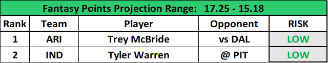 | 1 | ARI | Trey McBride | vs DAL | LOW |