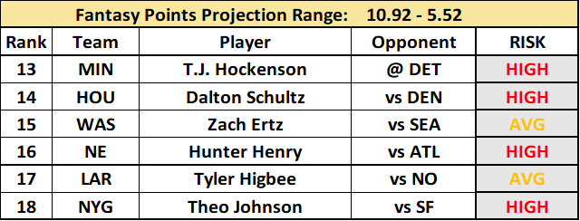 | 13 | MIN | T.J. Hockenson | @ DET | HIGH |