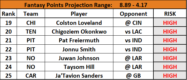 | 25 | CAR | Ja’Tavion Sanders | @ GB | HIGH |