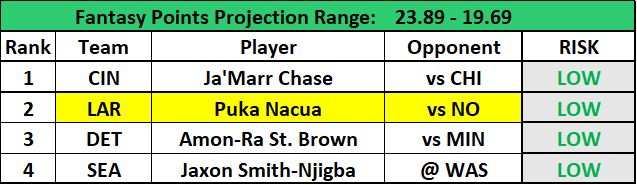 | 4 | DET | Jahmyr Gibbs | vs MIN | LOW |