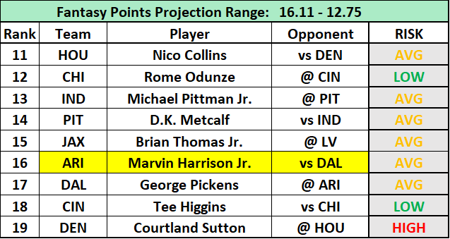 A: Ja’Marr Chase, Puka Nacua, and Amon-Ra St. Brown headline Tier 1. Managers looking for leverage should note Drake London’s volume surge and Marvin Harrison Jr.’s favorable Dallas matchup.