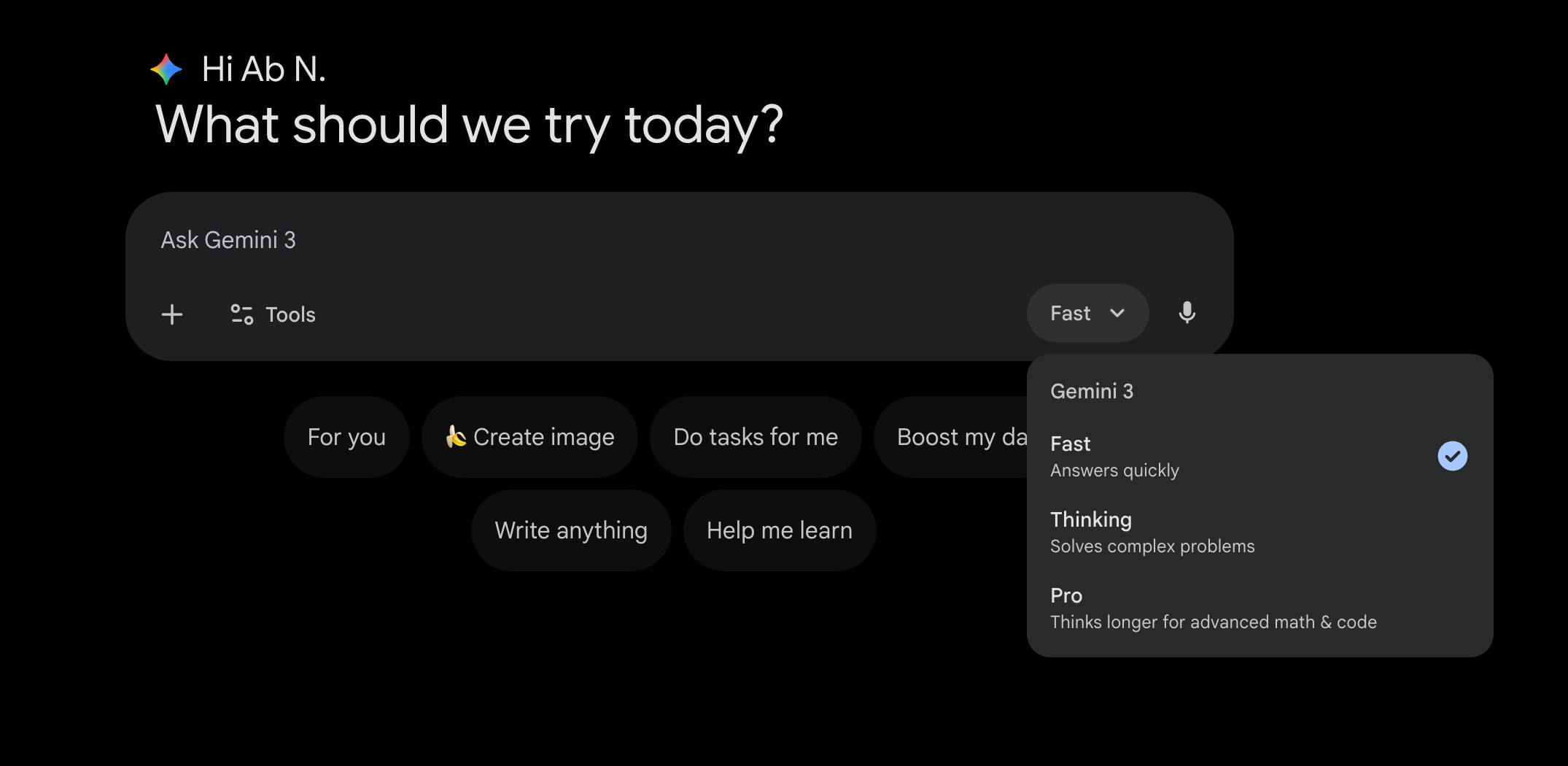 All Gemini users have “General access” to the Fast model (Gemini 3 Flash) that “Answers quickly.”
