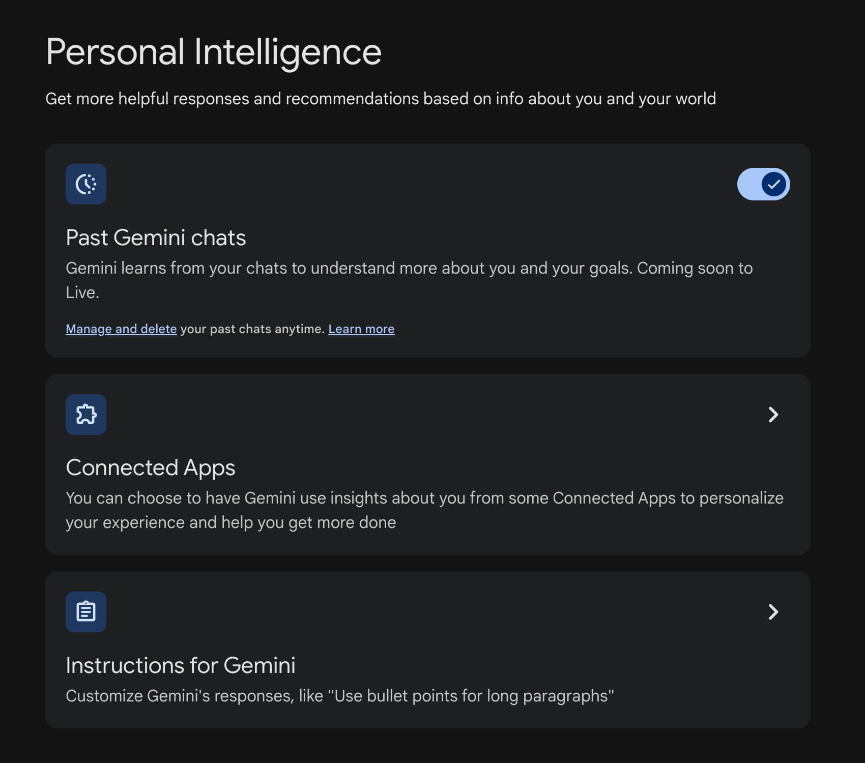 AI Pro subscribers have access to a “Past Gemini chats” setting wherein “Gemini learns from your chats to understand more about you and your goals.” This is very useful when starting a new conversation about something you’ve previously discussed with Gemini.