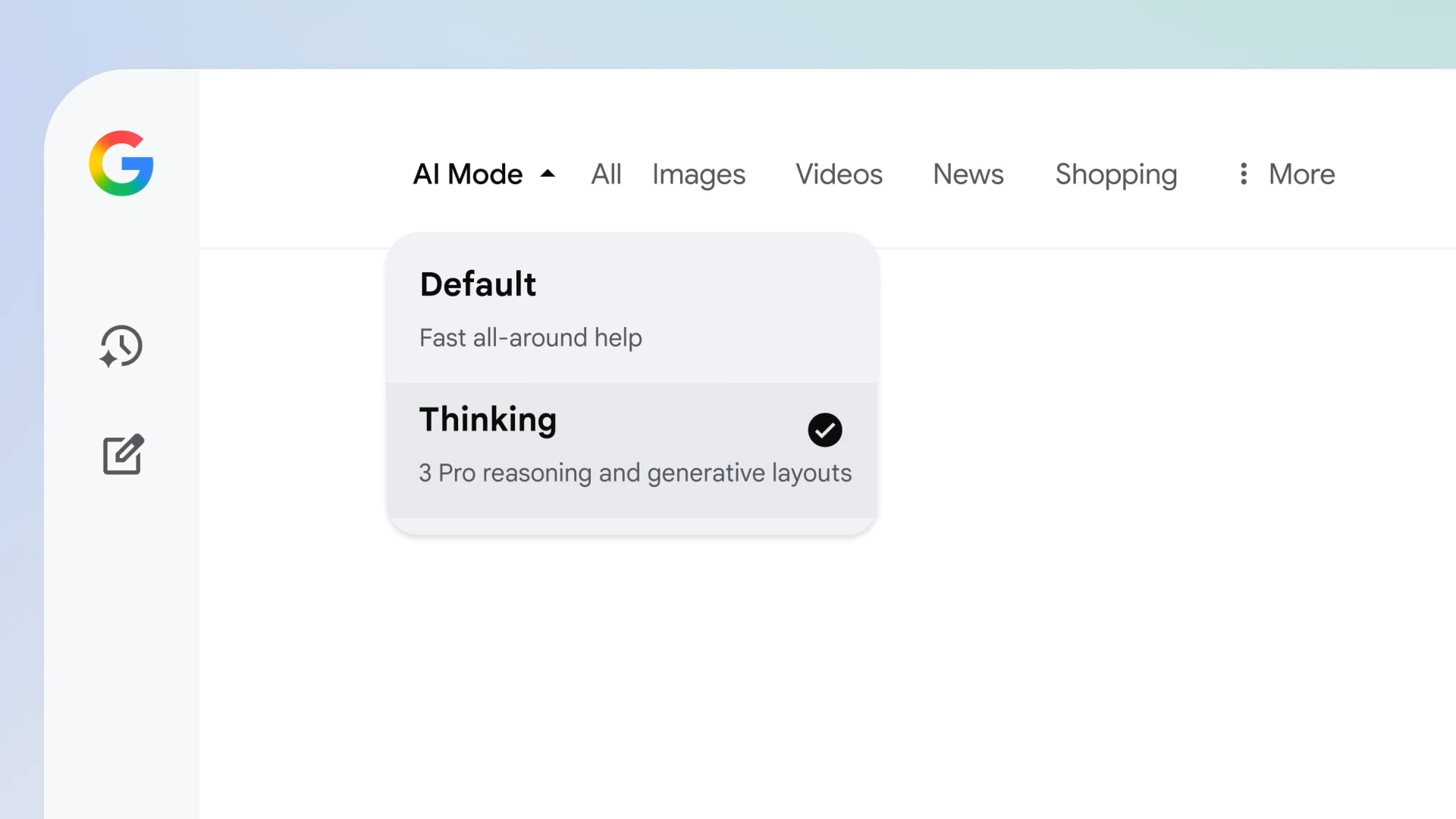 AI Pro subscribers can access Gemini 3 Pro with “reasoning and generative layouts.” In the top-left corner, “AI Mode” is a dropdown menu, with the “Default” model providing “Fast all-around help.”