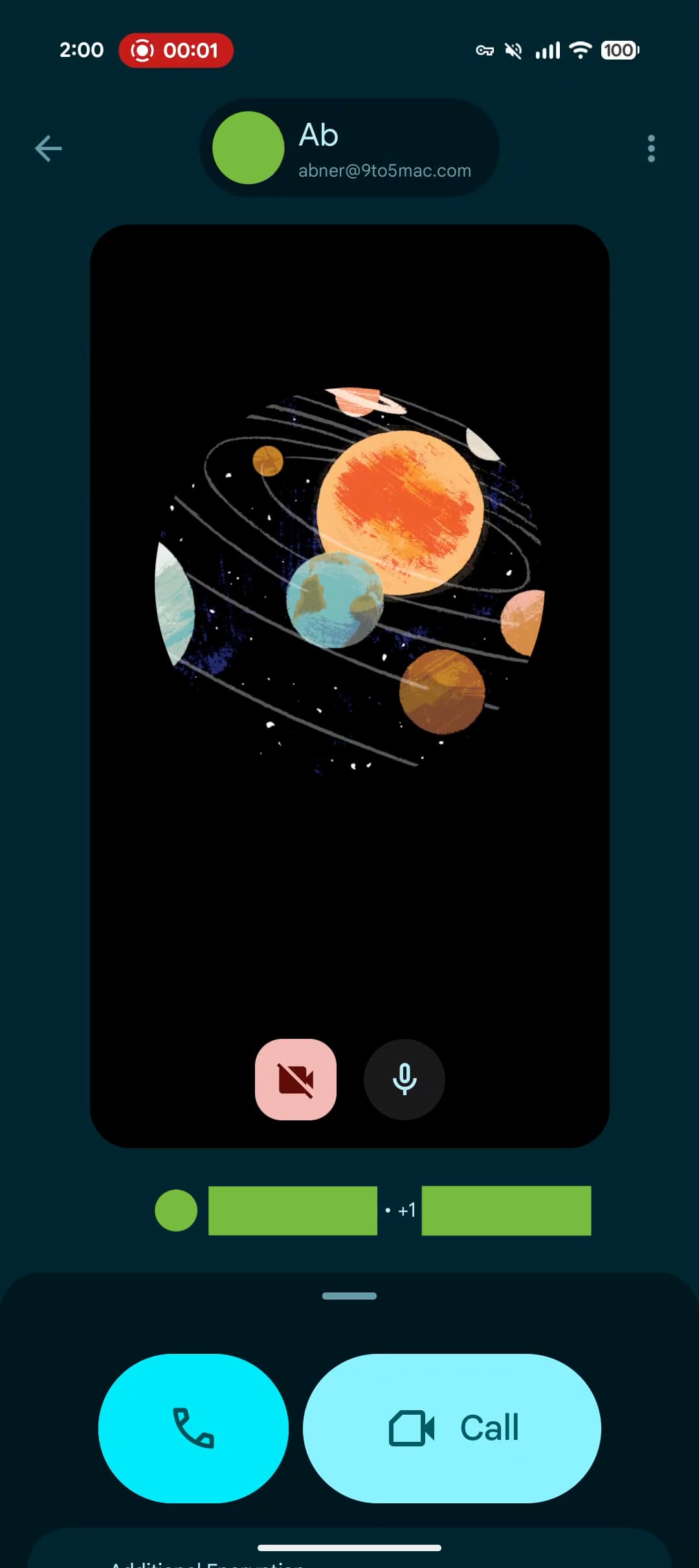 The pre-call screen sees more M3 Expressive with very large voice and video call buttons that seem out of proportion. The name, picture, and email address of who you’re calling is placed in a pill and centered at the top. Various buttons go from circles to rounded squares.