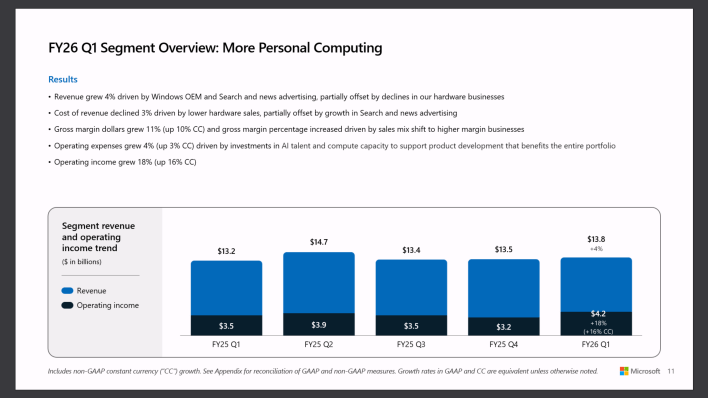 Revenue was $13.8 billion and grew 4% windows OEM and devices. Revenue increased 6% year over year, significantly ahead of expectations driven by strong demand ahead of Windows 10 end of support, as well as a benefit from inventory levels that remain elevated. Search and news advertising revenue T increased 16% and 15% in constant currency driven by growth in volume, as well as a continued benefit from third party partnerships. That was better than expected. And in gaming revenue decreased 2% and 3% in constant currency against a strong prior comparable Xbox.