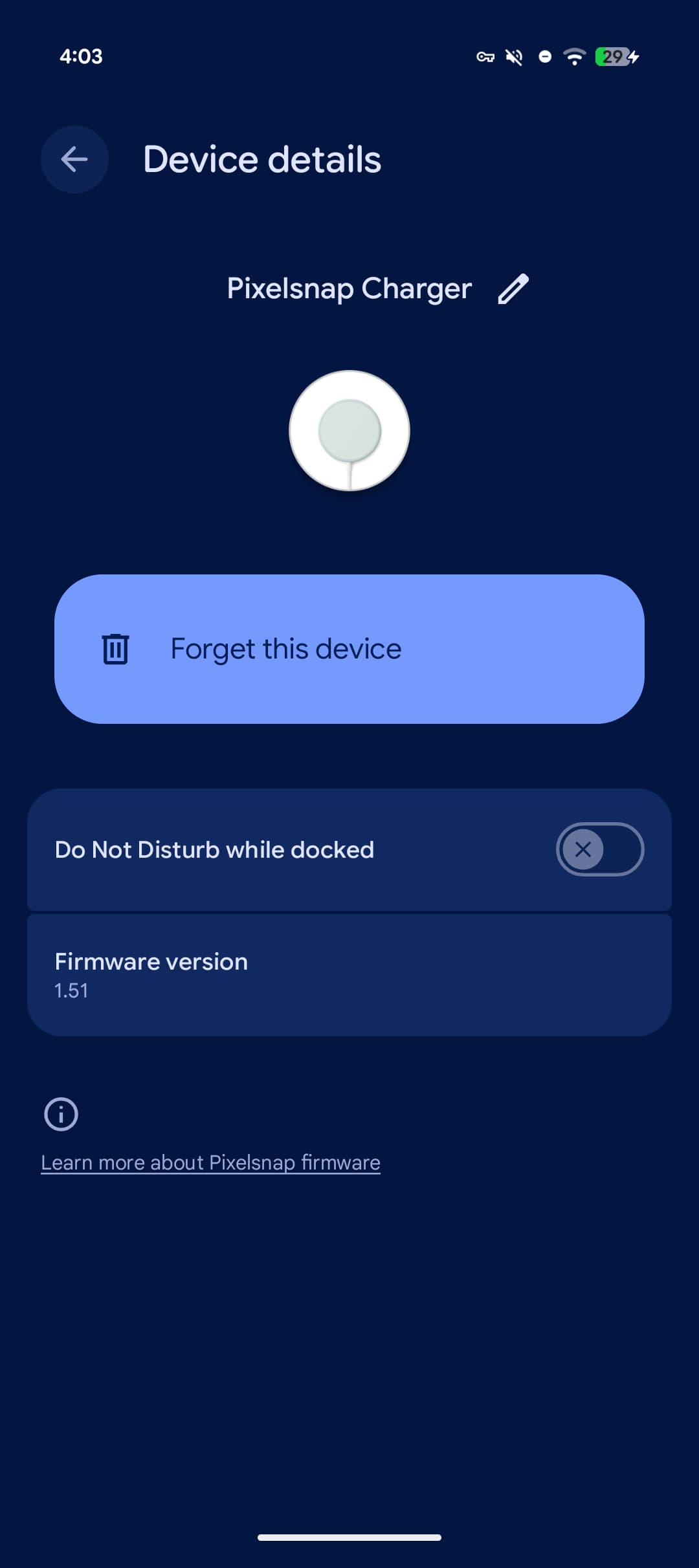 Google says Pixelsnap Chargers will automatically and silently update as they charge your Pixel phones. Go to Settings > Connected devices and select a charger to check the firmware. (Version 1.51.0 is the latest release.)