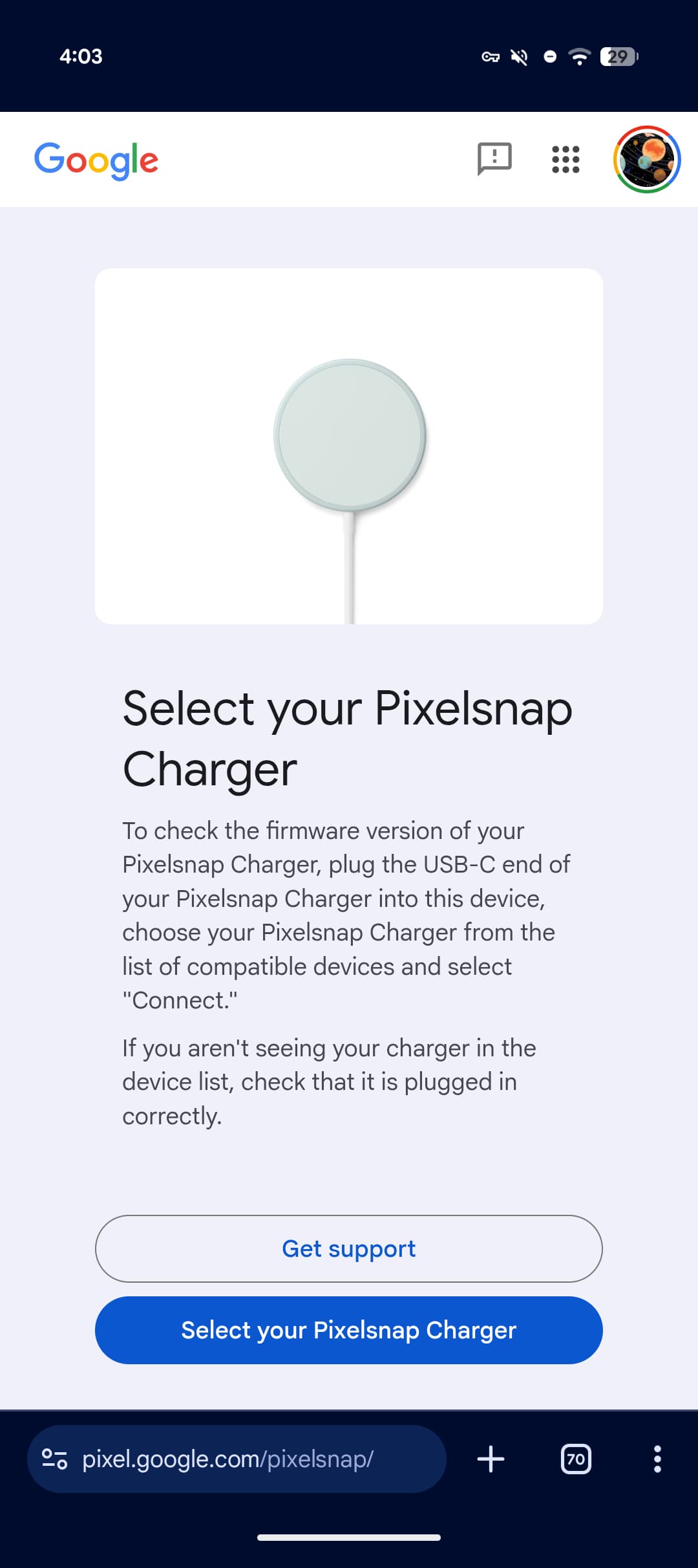If you’re not using a Pixel device but have purchased the $39.99 Pixelsnap Charger, Google offers “Manual updates.” This approach involves plugging the USB-C end of the puck into an Android 16+ phone and visiting pixel.google.com/pixelsnap in mobile Chrome. (This won’t work on the desktop browser.)